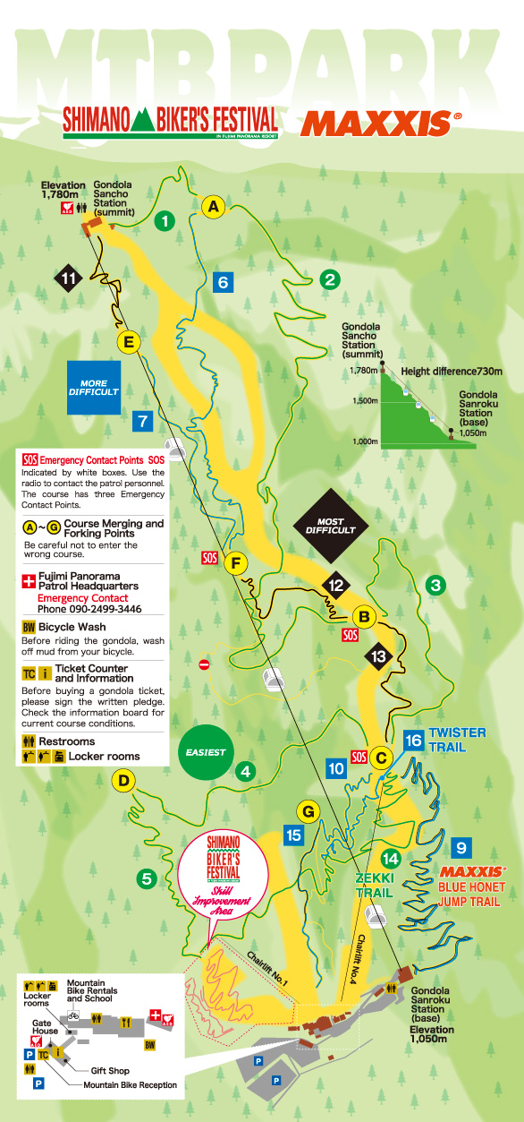 These trails are the steepest and narrowest with many challenging obstacles of rocks and tree roots. The rapidly changing surface conditions require the bikers to have the advanced controlling skill. Prepare yourself fully before biking down these trails.