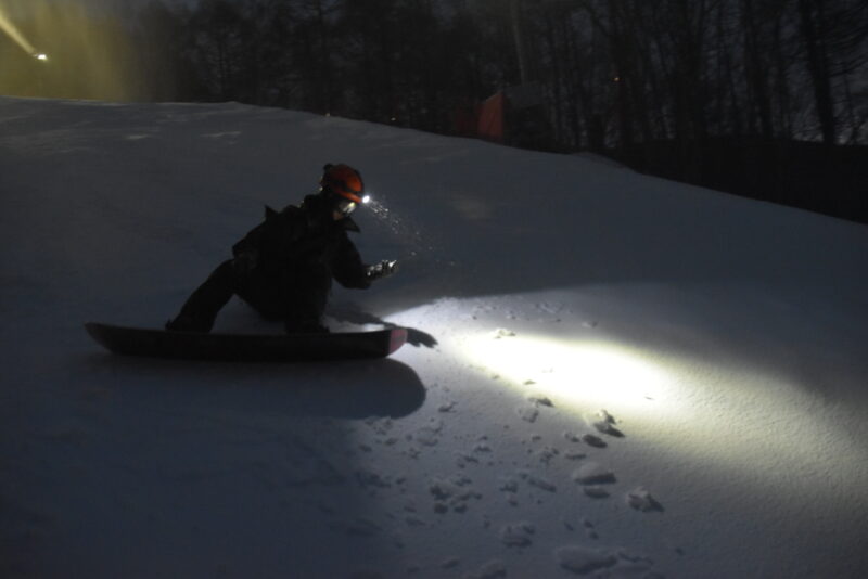 暗闇に響くマシンの音と、力強く吹き出す雪。