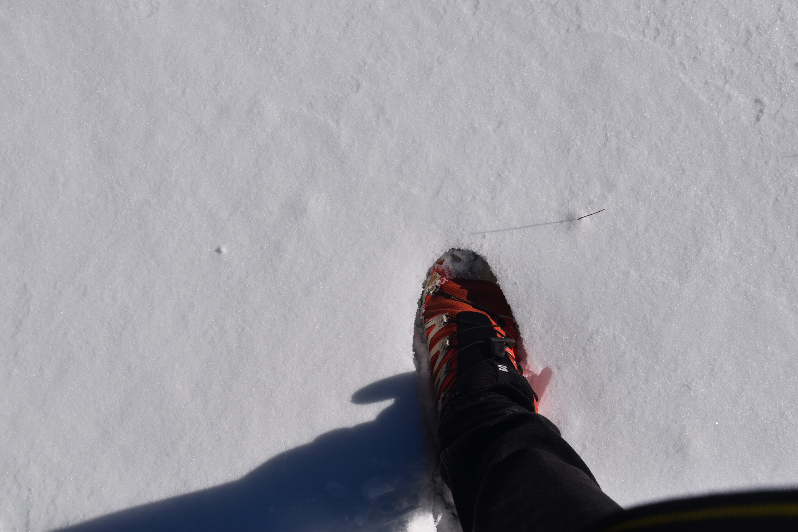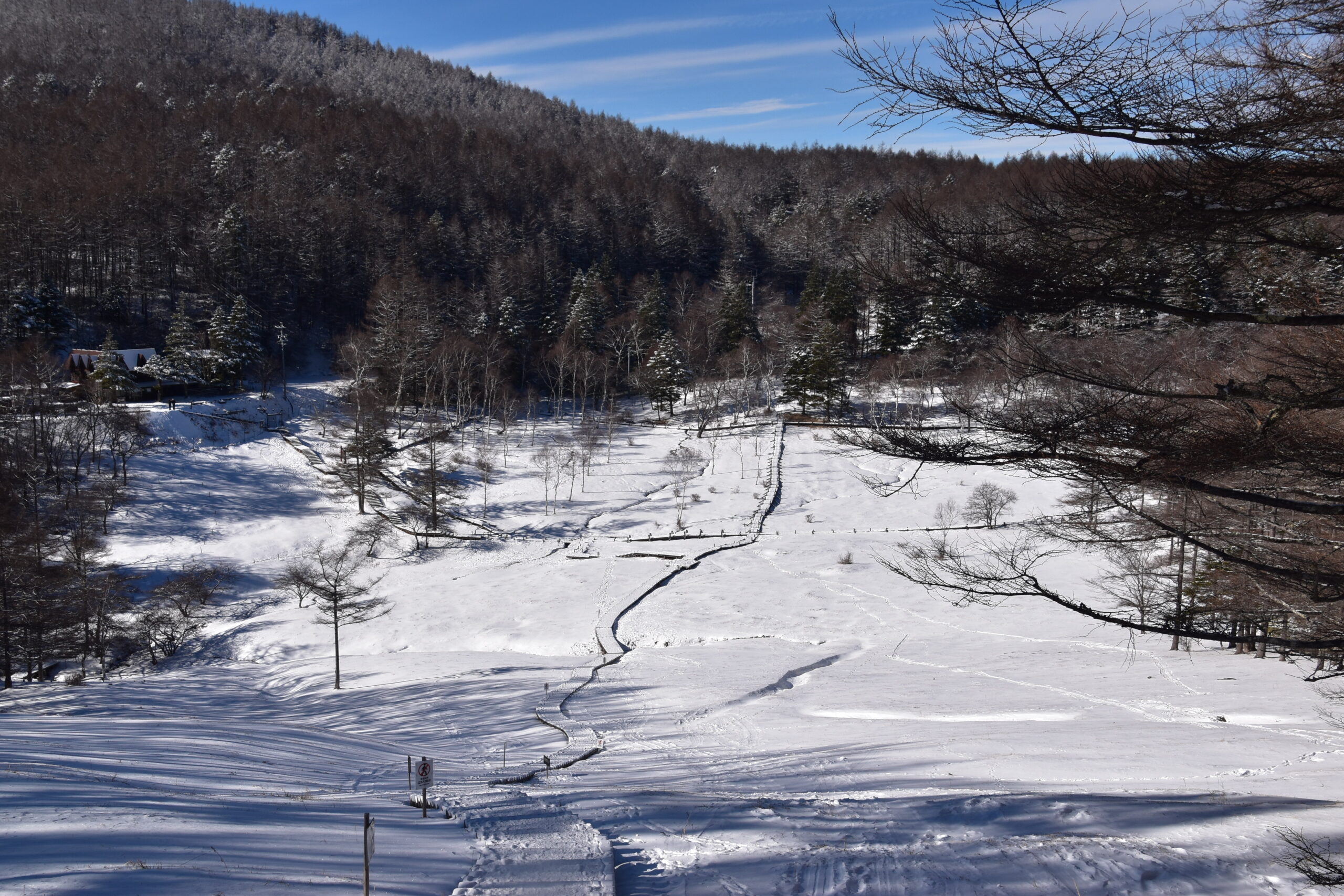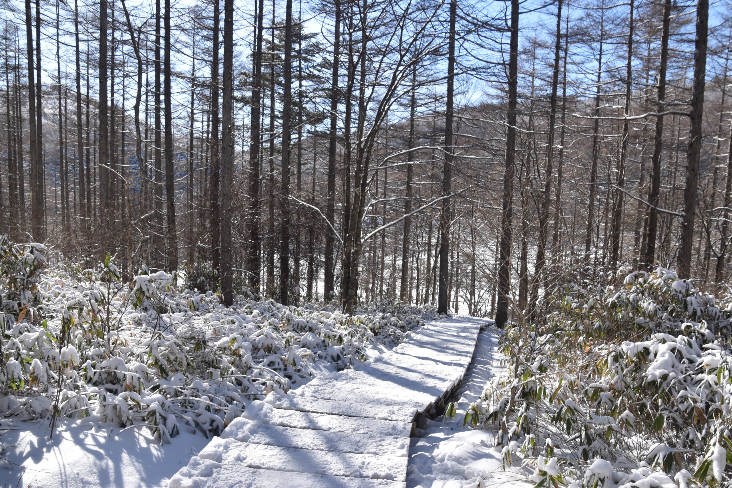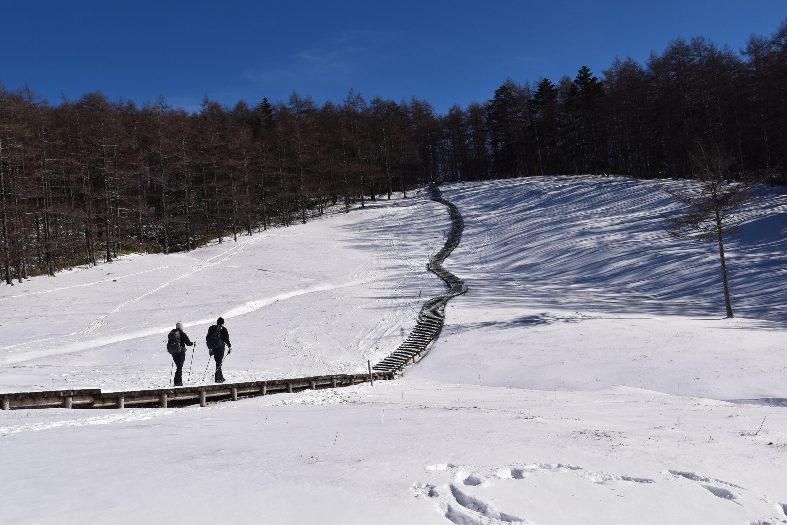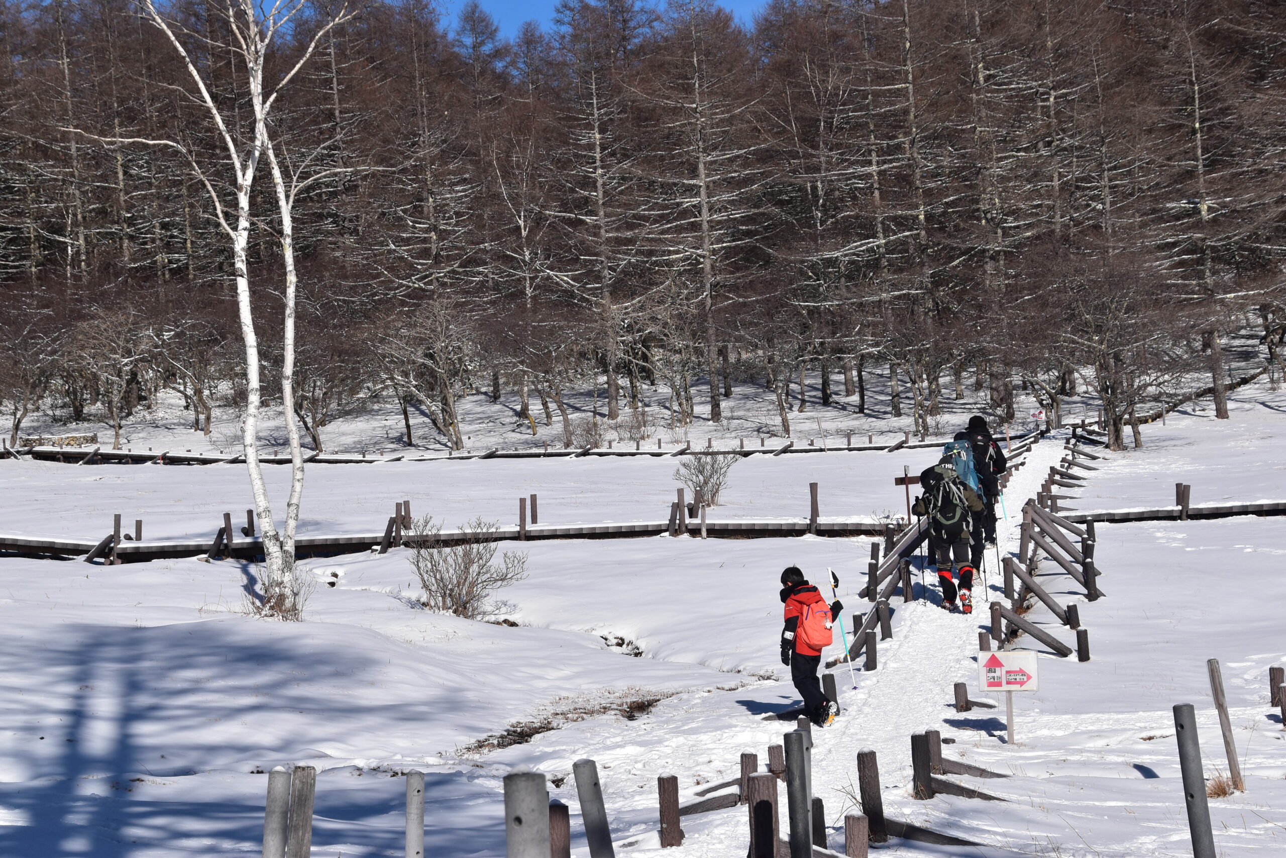 木道や登山道には雪がつき、場所によってはアイゼンが必要な箇所もありますが、入笠湿原ではスノーシューでの散策も楽しめるコンディションです。