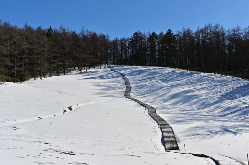 入笠山登山道周辺は冬らしい雪景色になってきちますが、周辺道路に積雪はなく、スムーズにアクセスできます。
