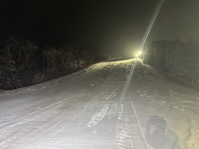本日は、雪の緩みおよび昨日の降雪の影響により、圧雪車が登坂できない状況でしたため、圧雪作業は「センター、ファミリーゲレンデ」のみ実施しております。