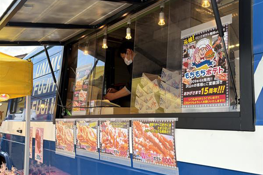 クネクネと長く独特の形の「もちもちポテト」は、味わいも食感も独特。一度食べたらヤミツキになるおいしさです。揚げたての旨さはもちろんのこと、通常のフライドポテトとちがい、冷めてもおいしいのが「もちもちポテト」。冷凍じゃないポテトを使用し、100%手作りの「もちもちポテト」は他には真似できない旨さです。