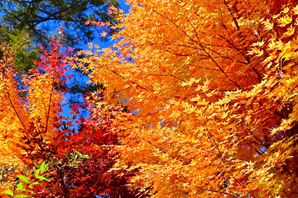 夏の名残を残す緑の葉に、紅や橙、黄金色のモミジが混ざり合いまた、風が吹くたびにひらりと舞う一枚一枚が、季節の移ろいをそっと語りかけてくれます。