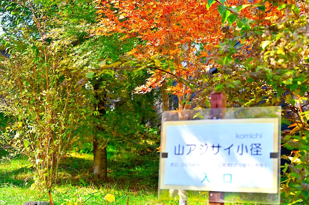 下山後、チケット販売所奥の山あじさい小径に目を向けると、足元から頭上まで秋の彩りが静かに広がっております。