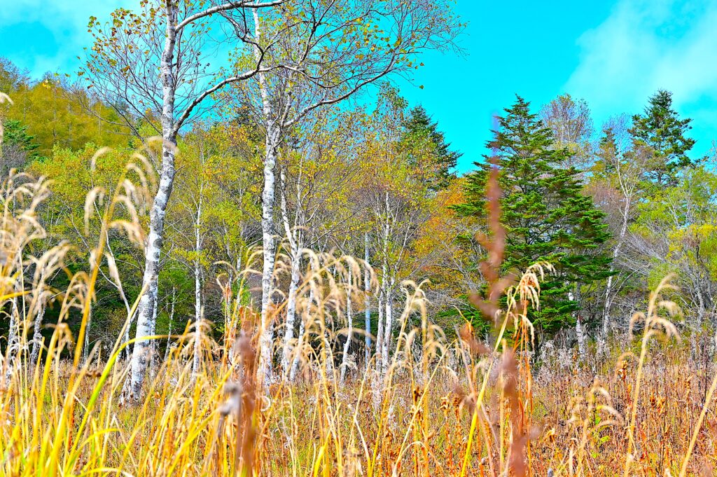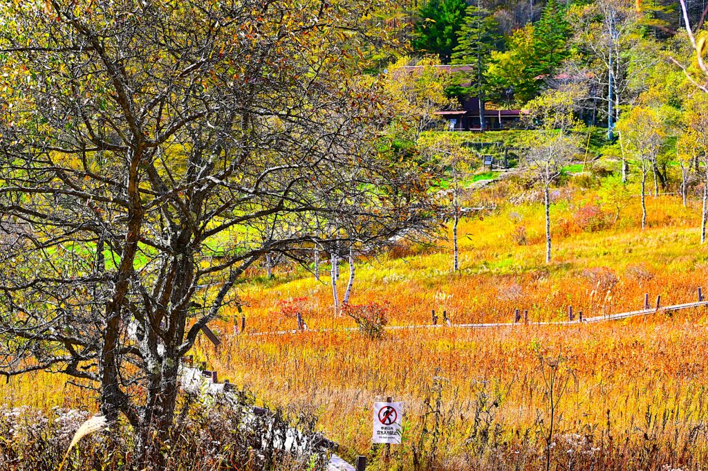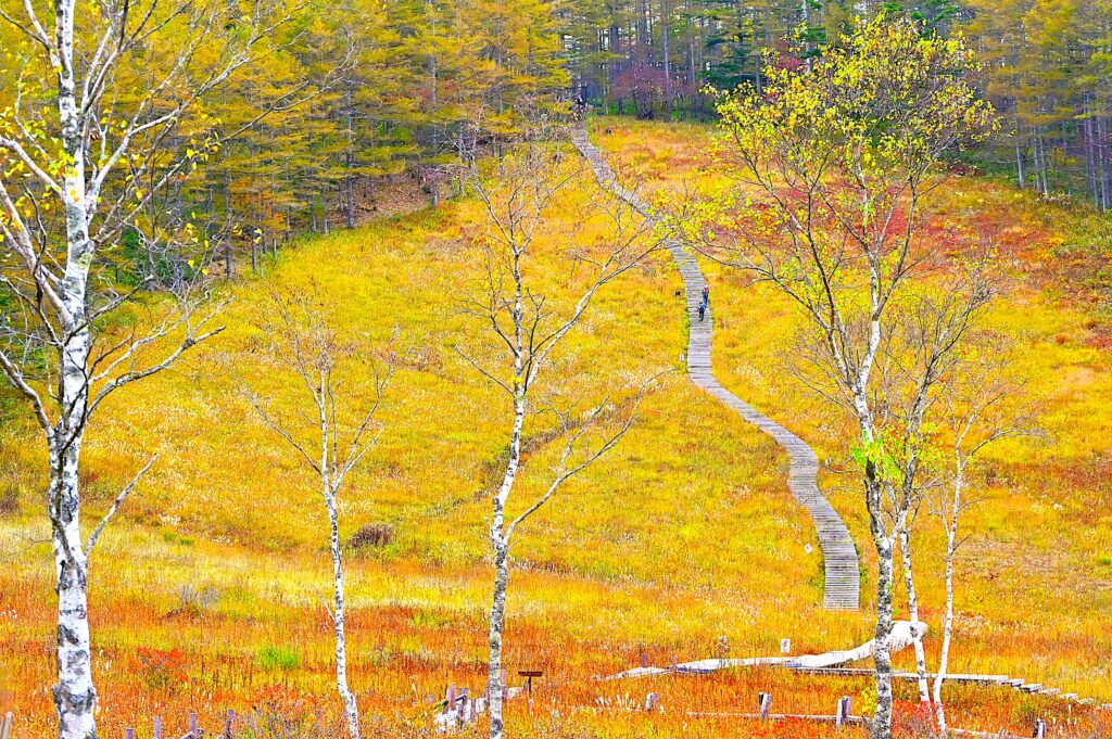 入笠湿原では黄金色に輝く草紅葉が、山野草公園では紅く染まったモミジやカエデが、まるで絵画の中に迷い込んだような感覚を誘います。