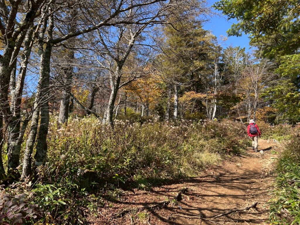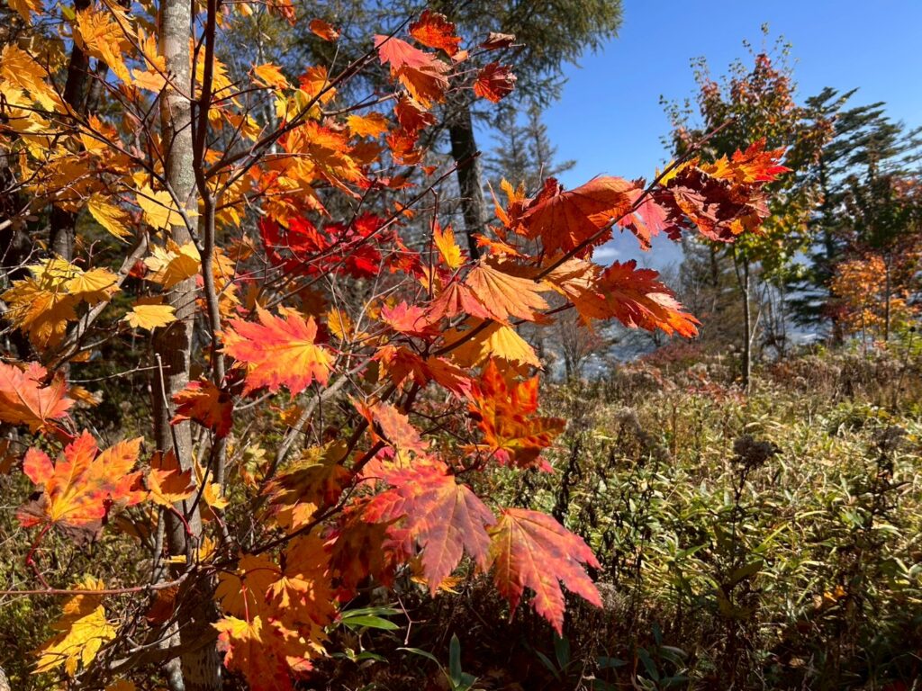 足元には色づき始めた木々や赤く染まった葉が広がり、秋の深まりを感じさせます。