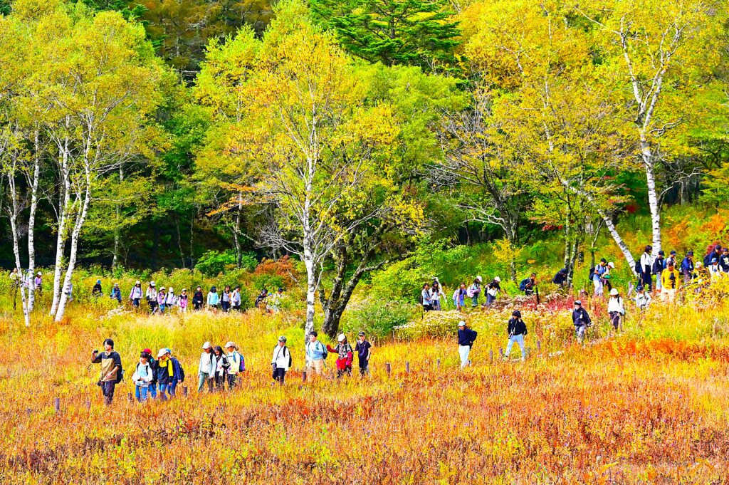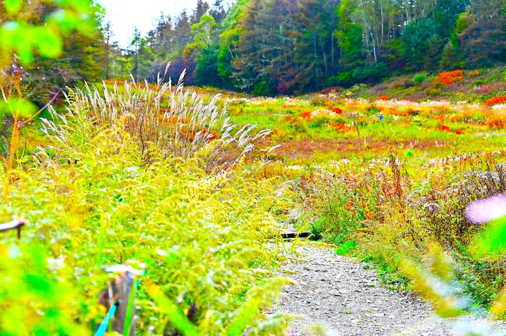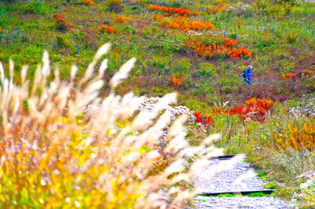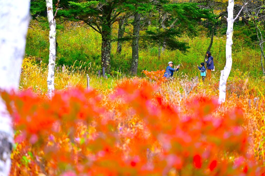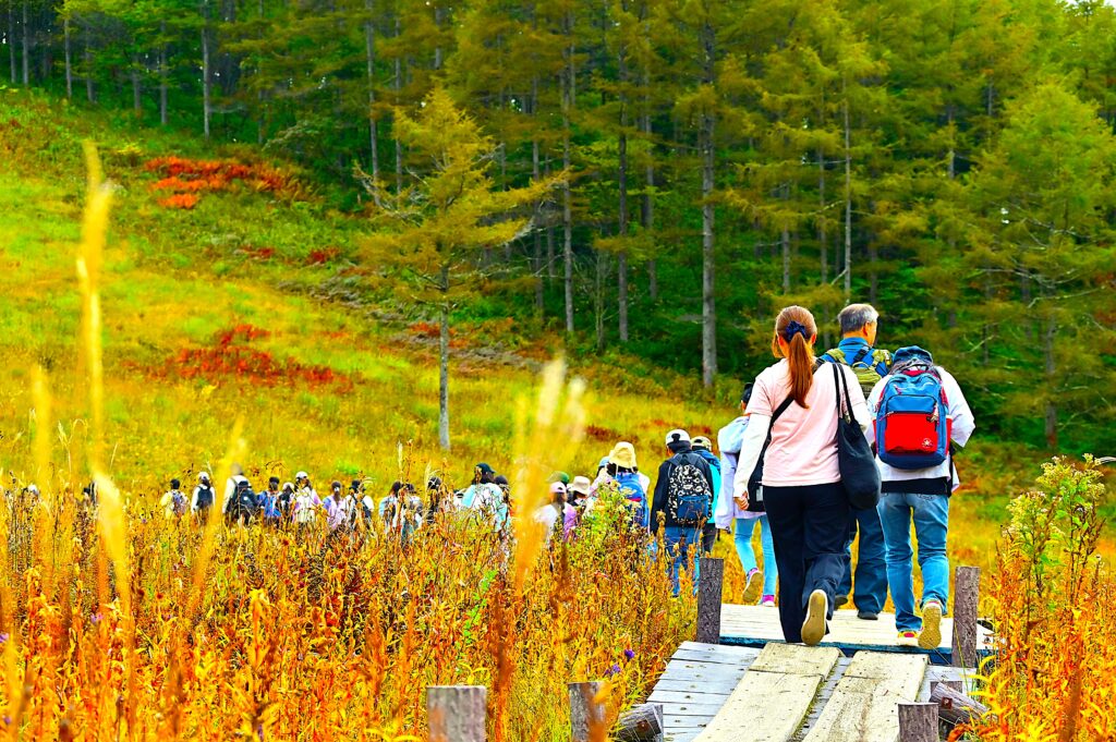ゴンドラで一気に標高を上げ、色づく木々に目を奪われながら歩くと、黄金色に染まる湿原が迎えてくれました。足元には紫紺のエゾリンドウから黄金色へと移ろうグラデーションに足を止め、晩秋の深まりを感じるひとときを楽しめます。