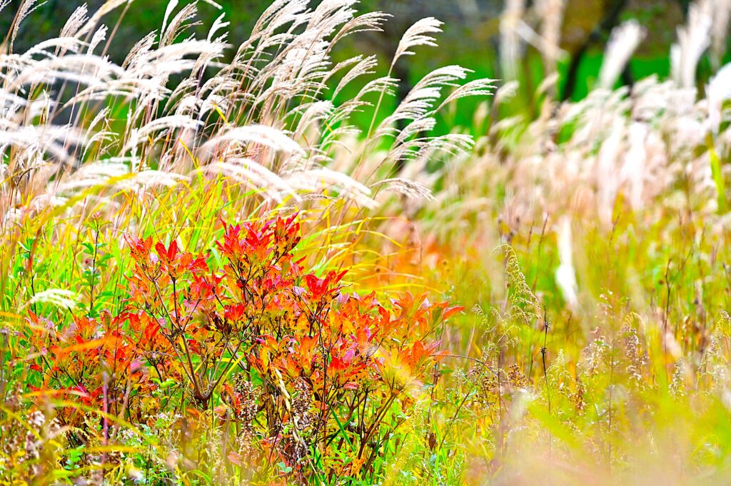 ススキに囲まれたお花畑では、香ばしい色の中に朱色がひときわ輝き、生命力を感じる瞬間も。自然の中で季節の変化を見つけるたび、心が前向きに。