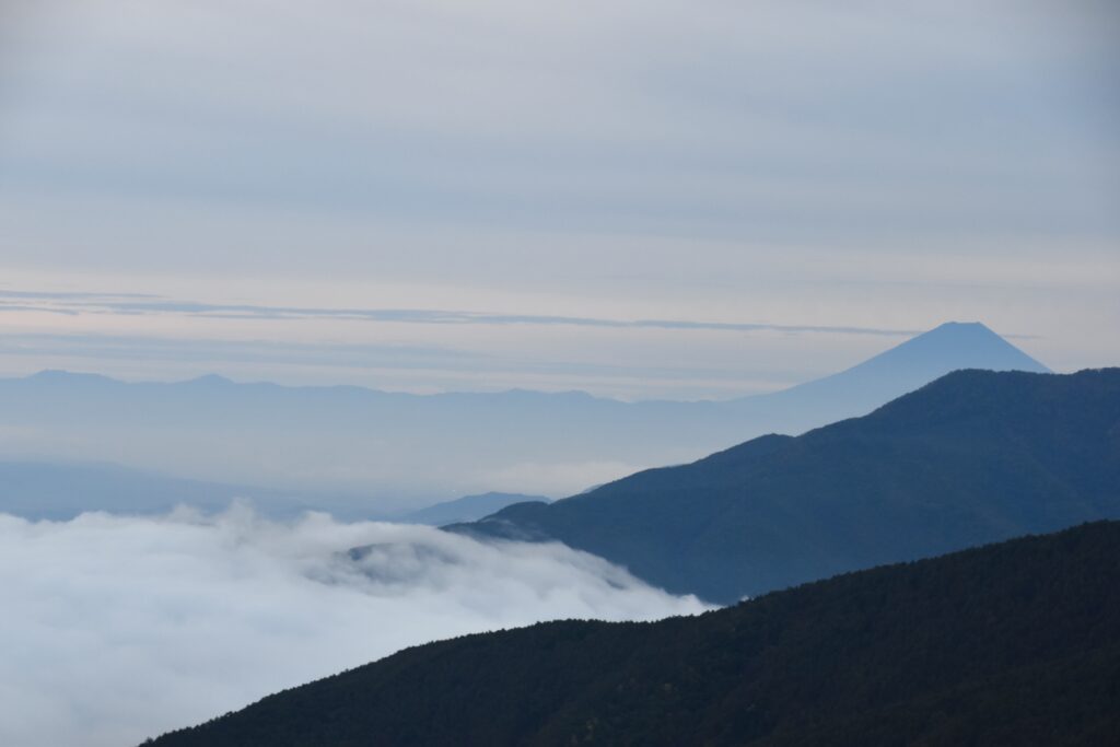 目の前一面に広がる雲海、その上に浮かぶ八ヶ岳、霞むように見える富士山。