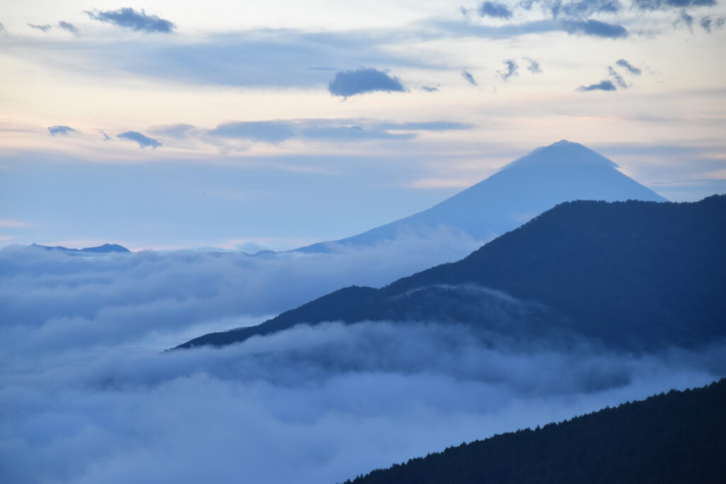 雲の間からゆっくりと姿を現す富士山、