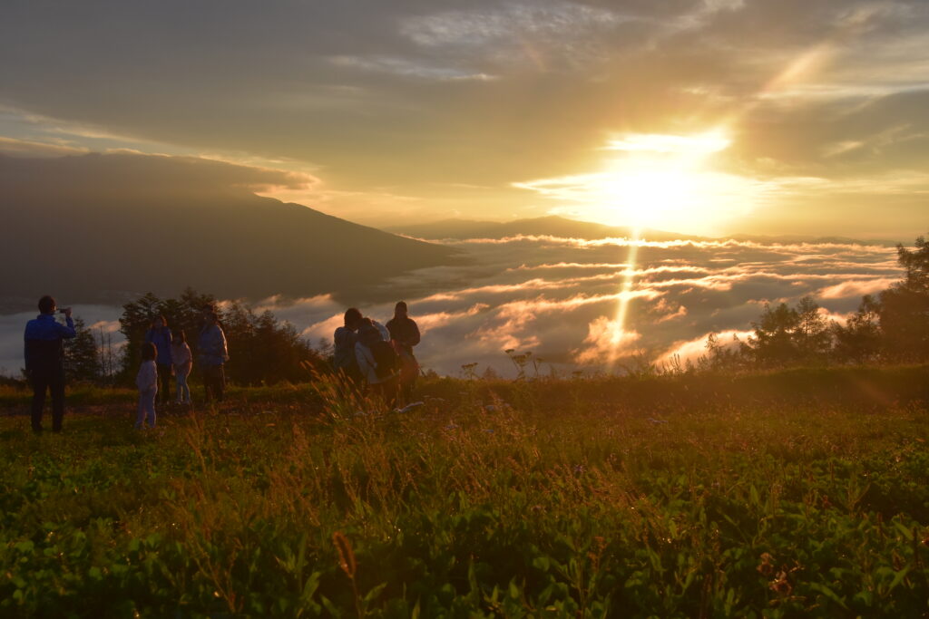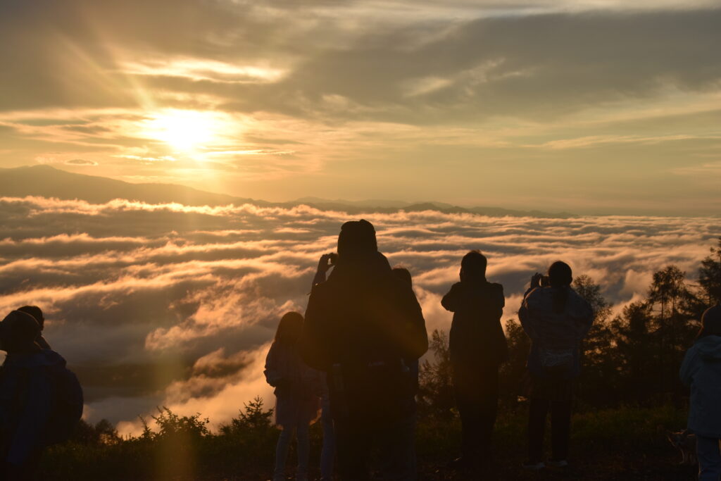 展望台には、秩父山系から姿を現すご来光の瞬間を見逃すまいと集まった多くの方々の姿がありました。