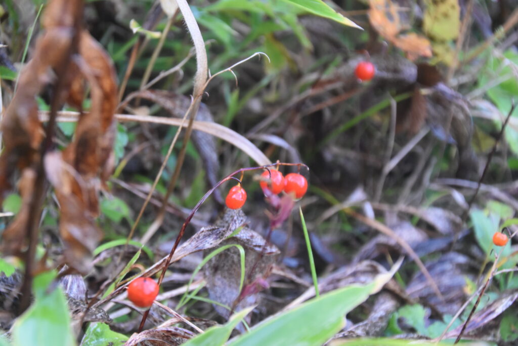 足元には、春に白い花を咲かせたすずらんが実をつけ、黄金の草紅葉に赤い彩りを添えています。