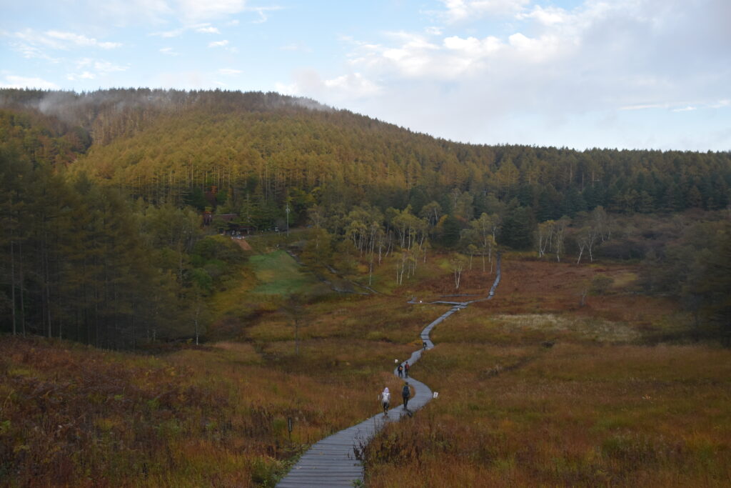 入笠湿原へと続く木道の上では、