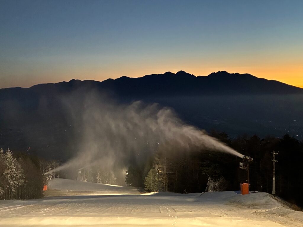 降雪機の稼働も進めており、冷え込みの強い時間帯を活かしてゲレンデ上部の雪づくりを行いました。
