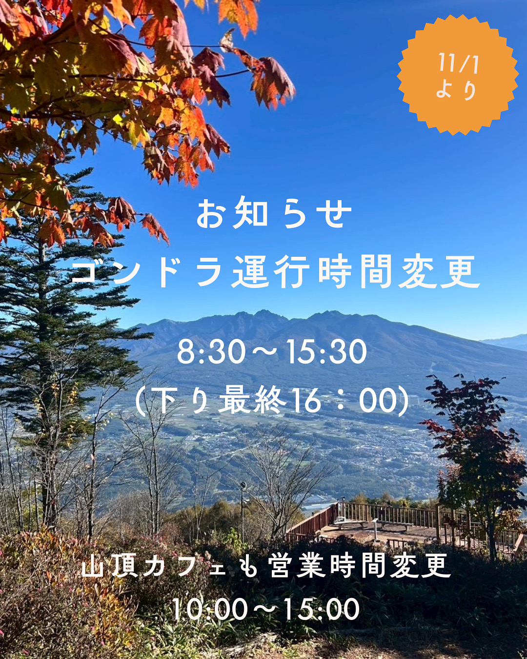 【お知らせ】 11月1日(土)より、ゴンドラの運行時間が変更になります。 🚠 ゴンドラ運行時間 8:30〜15:30(下り最終16:00) ☕ 山頂カフェ 営業時間 10:00〜15:00 山麓の売店もゴンドラ運行時間の […]