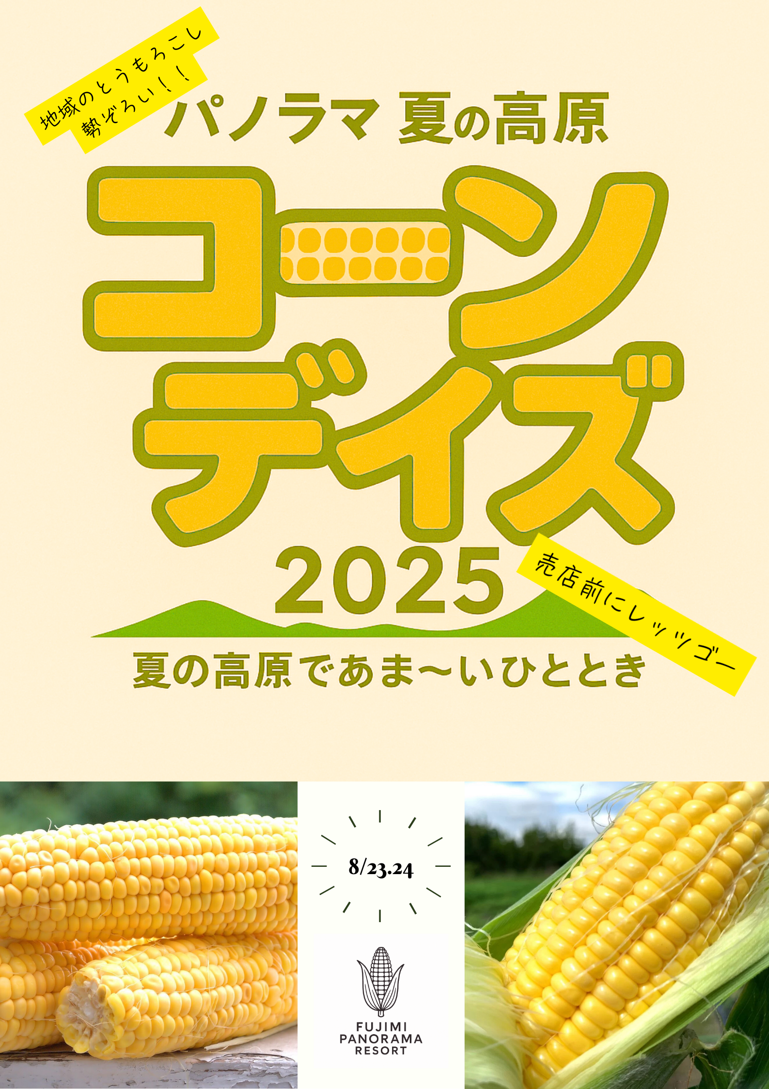 8/23(土)、24(日)に開催されるコーンデイズ2025! レストランオリオンでは、天ざるそば(とうもろこしの天ぷら付)と、つぶつぶコーンの冷製スープを販売いたします🌽 この2日間しか味わえないとうもろこしメニューをぜ […]