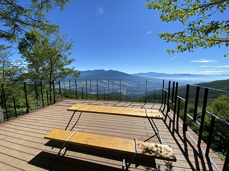 八ヶ岳を正面に富士山や甲斐駒ヶ岳などのパノラマビューを楽しめる展望台は、写真撮影やハイキングの休憩場所にも大人気。